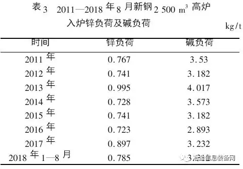 2013 年,新鋼2 500 m3 高爐入爐鋅負(fù)荷、堿負(fù)荷分別高達(dá)0. 995 kg /t 和4. 017 kg /t( 見表3) ,遠(yuǎn)遠(yuǎn)高于國標(biāo)要求。高爐90% 以上的鋅負(fù)荷和60% 左右的堿金屬負(fù)荷來自燒結(jié)礦,這也是爐料結(jié)構(gòu)中高比例燒結(jié)礦給高爐生產(chǎn)帶來的新問題,同時(shí)也是近年來新鋼兩座2 500 m3 高爐有不同程度結(jié)厚的重要原因。近年來新鋼2 500 m3 入爐鋅負(fù)荷、堿負(fù)荷情況見表3。